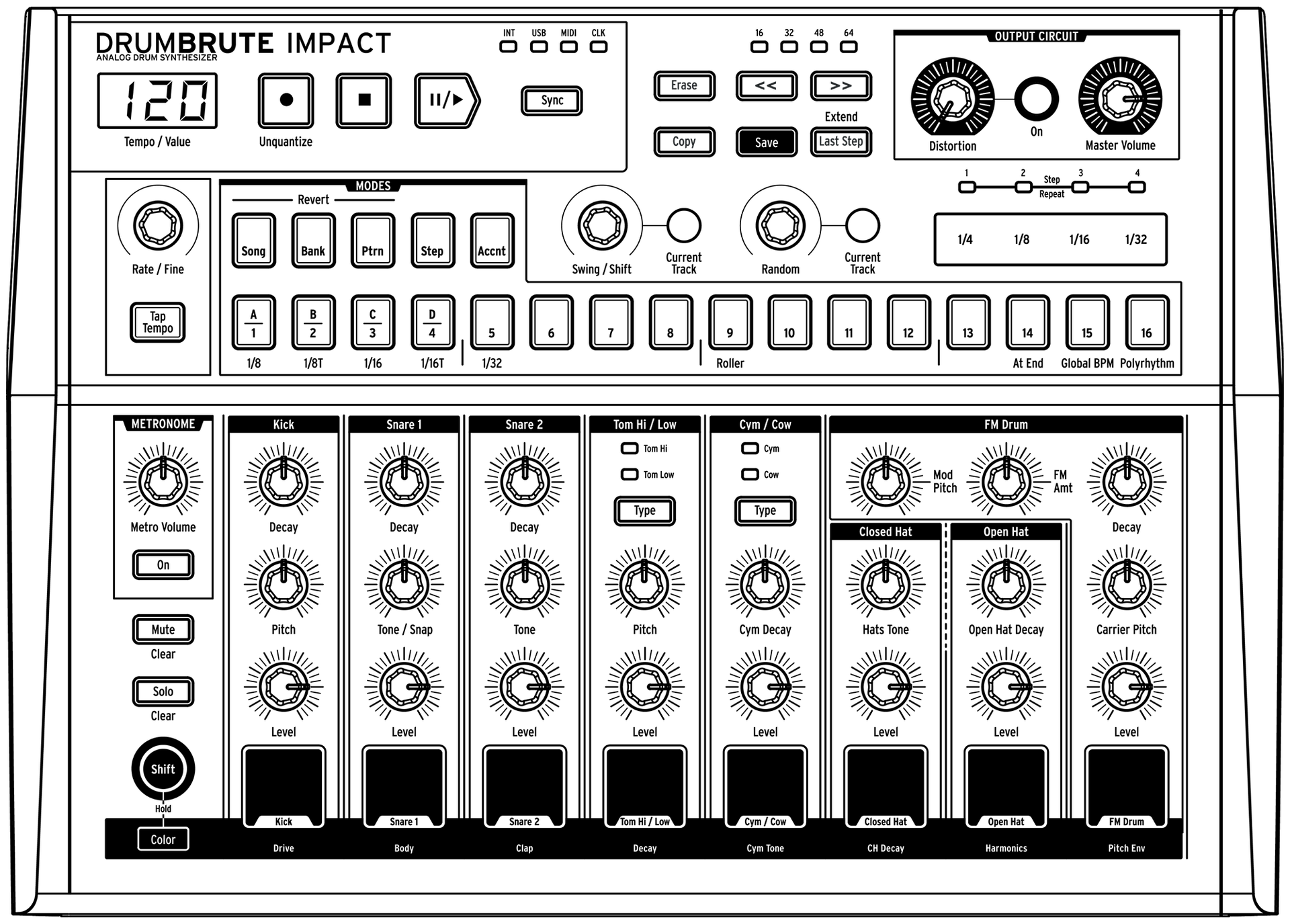 A todo el mundo le gusta ensuciarse las manos de vez en cuando, y la DrumBrute Impact te da acceso instantáneo a una distorsión de salida sencilla pero increíblemente efectiva.