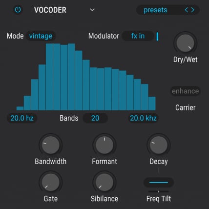 20 algorithms including Shimmer Reverb, MultiBand Compressor, Distortion, Vocoder, and more.