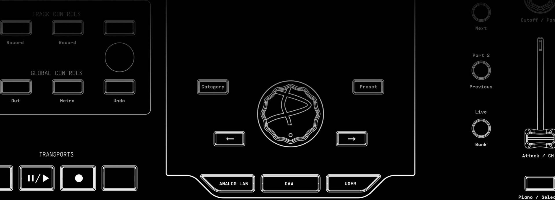 - Select sounds, browse presets, switch parts, smart-assigned controls.