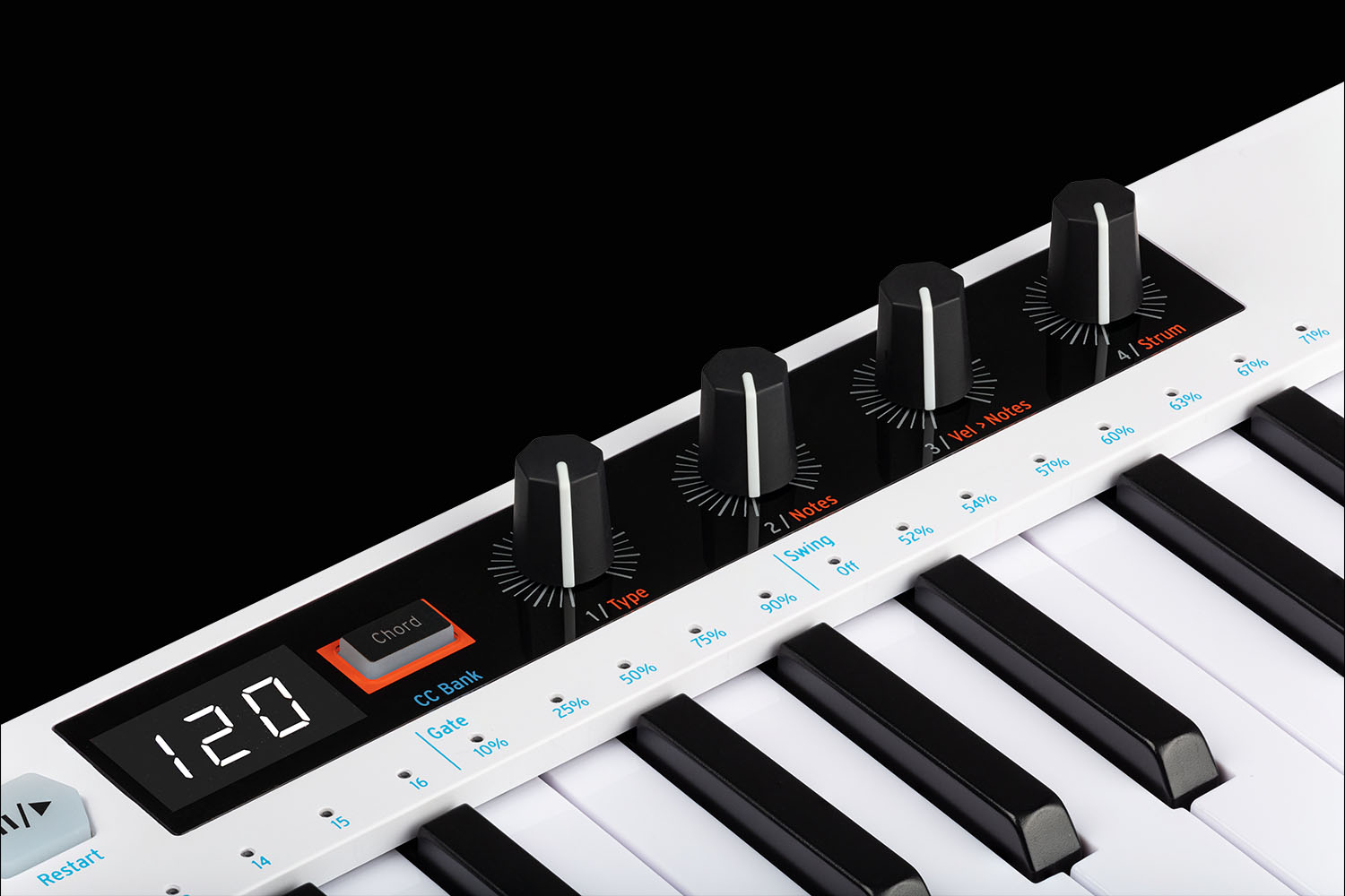 KeyStep 37’s unique & enhanced Chord mode takes your single note melodies and unfinished ideas and transforms them into musical stepping stones. Choose from multiple voicings, instrument-like strum effects, and velocity settings and make your music really sing.