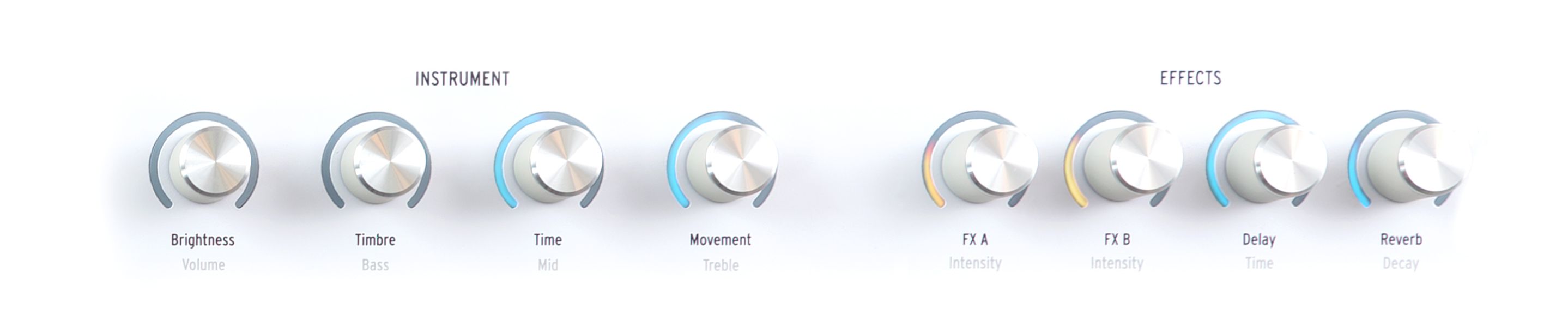 Brightness、Timbre、Time、Movementの各ノブで、一度に複数のパラメーターを同時に操作できます。フィルターを開き、歪みを加え、ステレオイメージを広げるといった操作がたった1つの動作で可能です。パネルを煩雑にすることなく、深みのある表現力豊かな音色変化を実現できます。