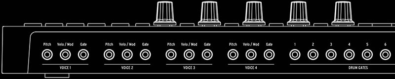 Using the four sets of CV outputs you can control 4 individual monophonic instruments, or one instruments with up to 4 voices of polyphony, or any combination in between.