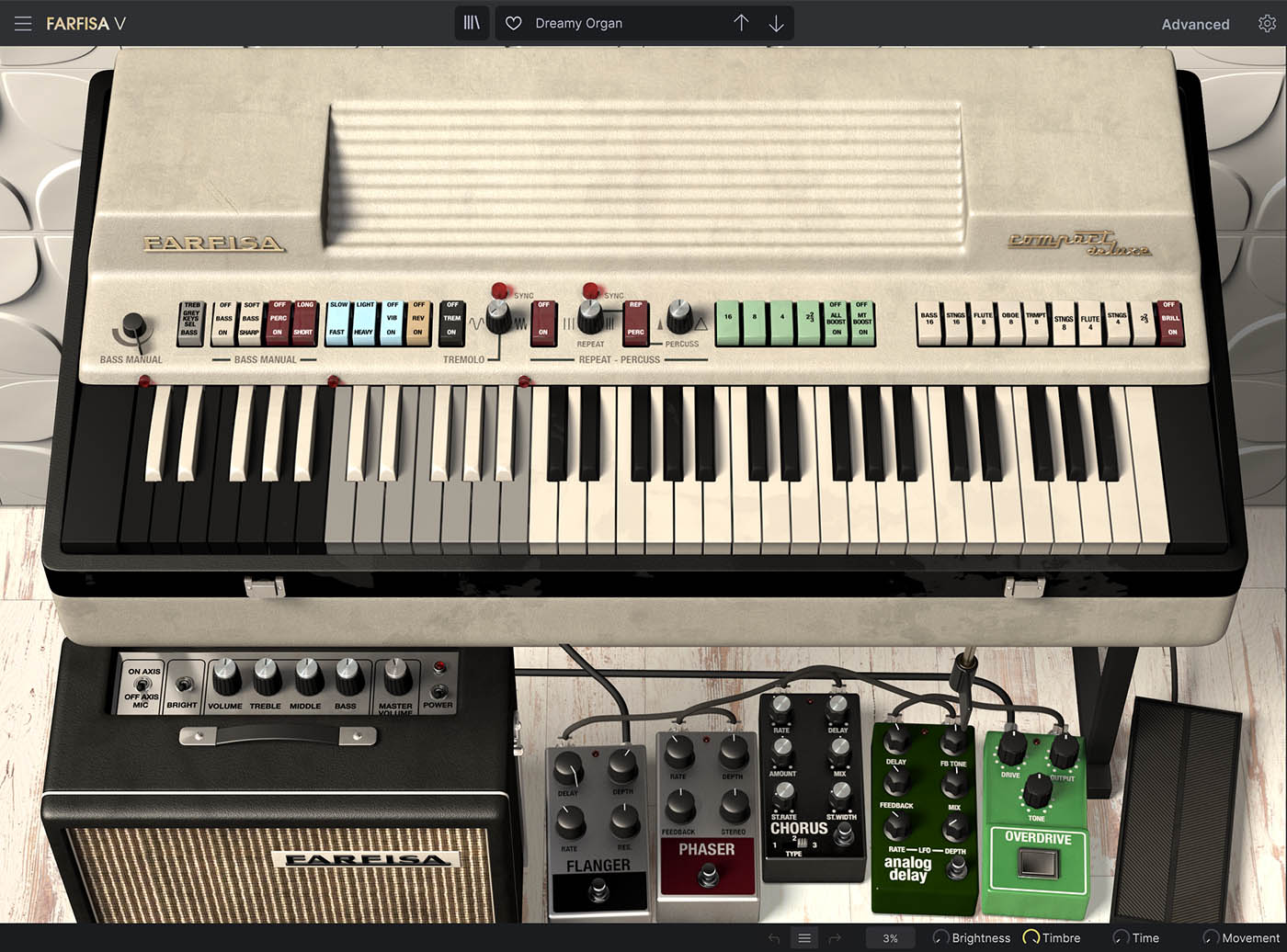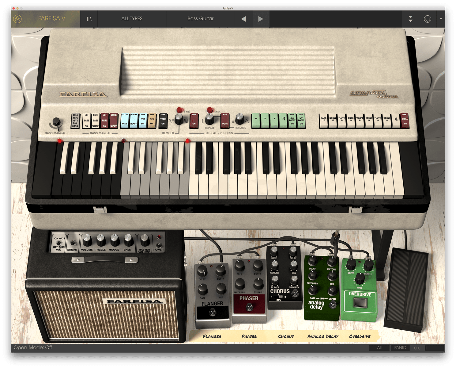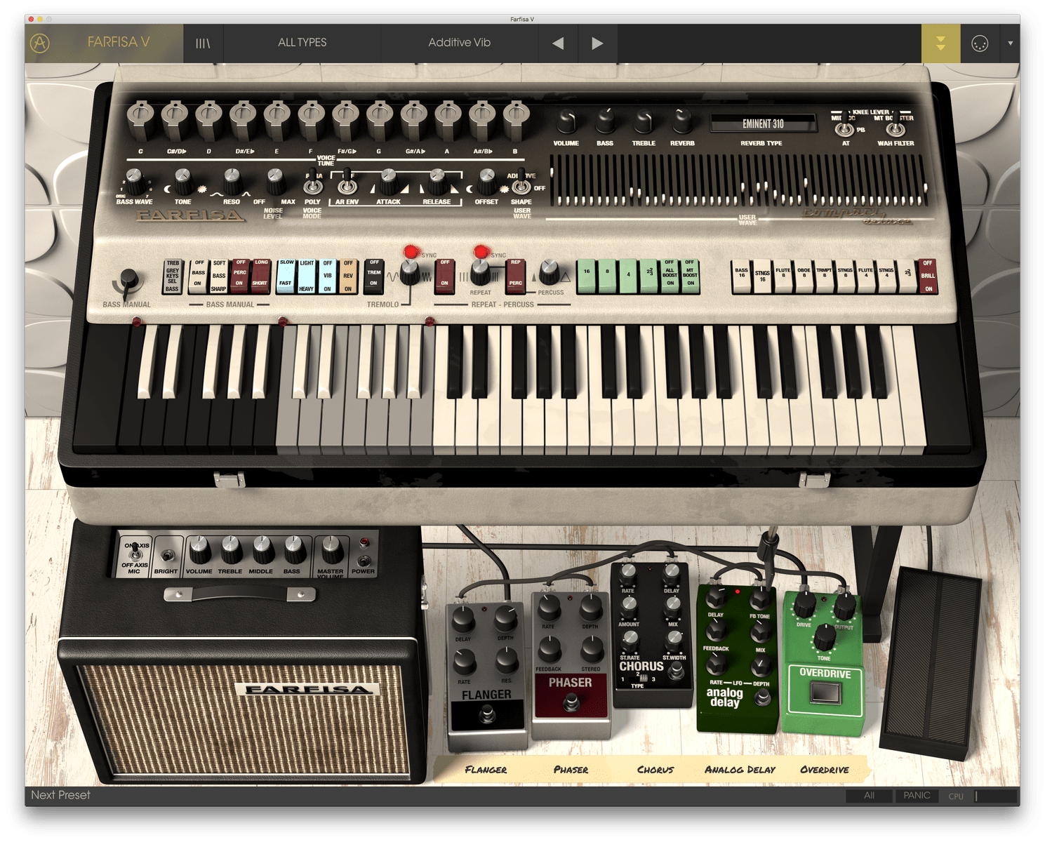 Farfisa V reproduces all the controls of the Compact DeLuxe, then adds retro-tastic FX and amp simulation.