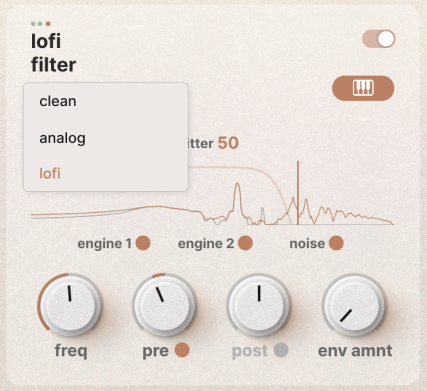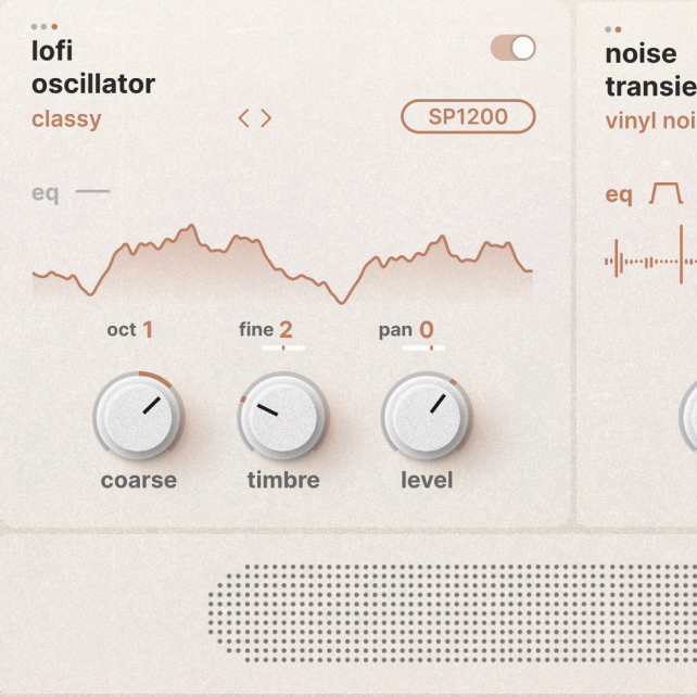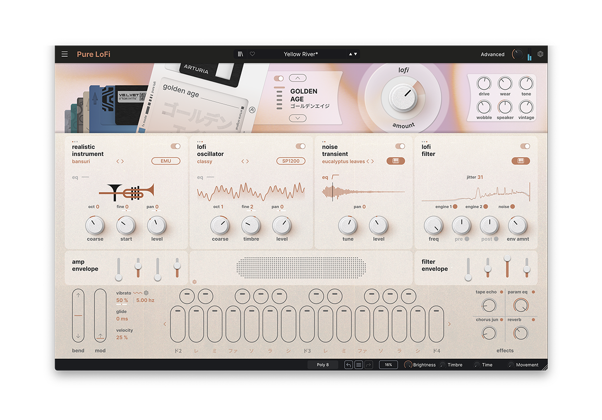 マルチサンプリングされたインストゥルメントとデジタル・オシレーター、そして専用のノイズ・レイヤーがブレンド ─ まさにローファイなサウンド・デザインのためのキャンバスです。