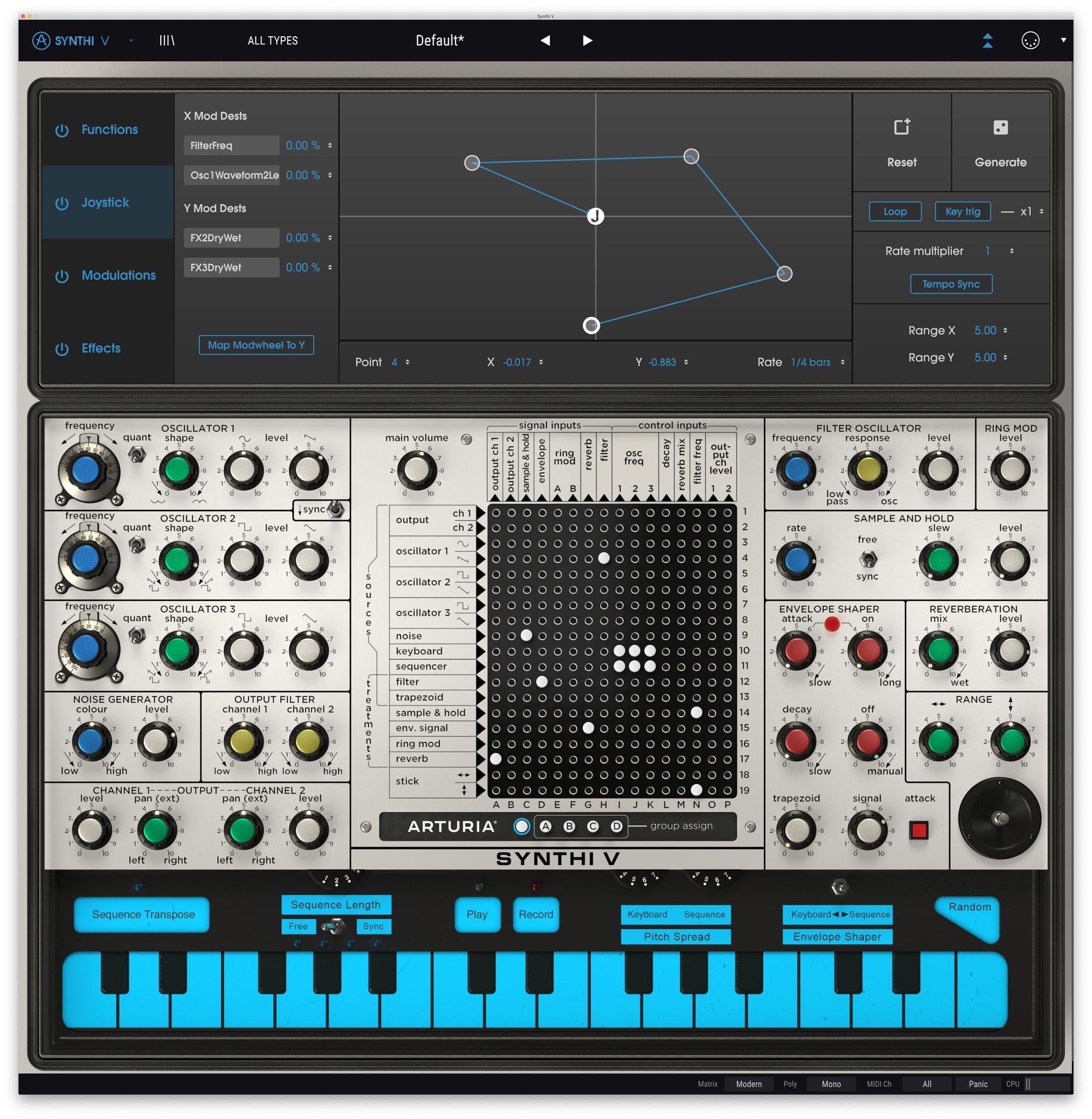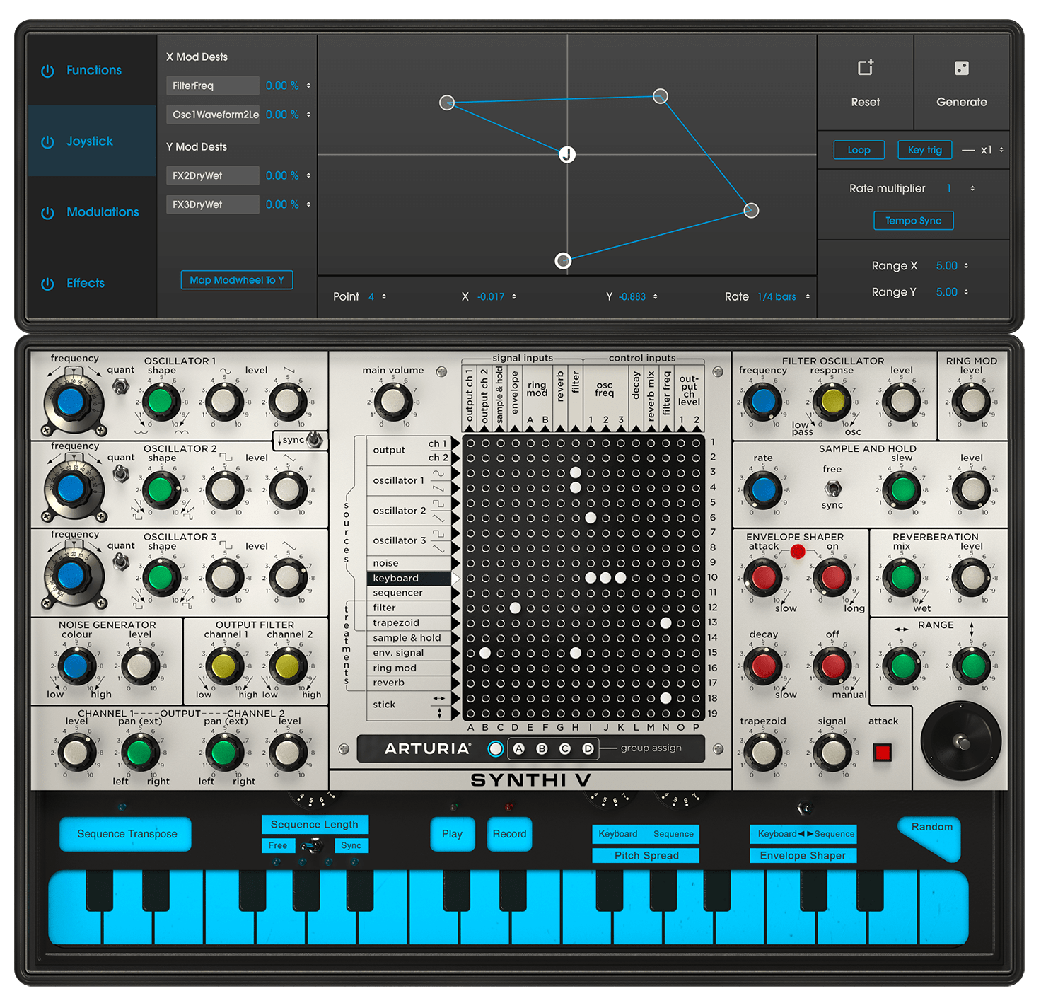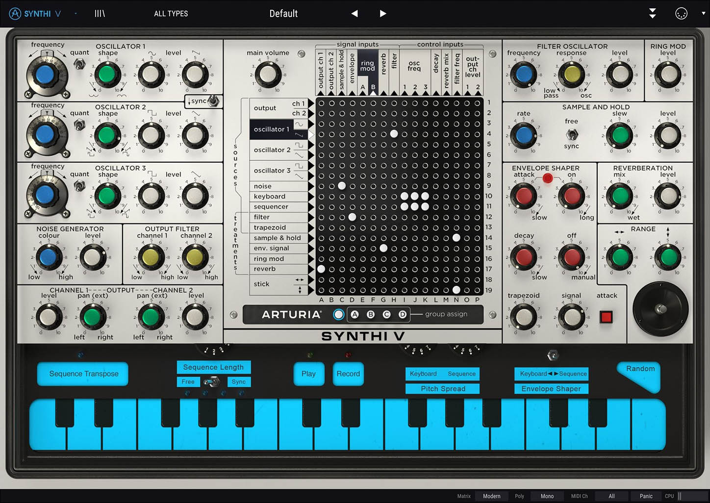 Synthi V’s main interface captures all the charm of the original, with a handful of small tweaks that add up to a big difference.