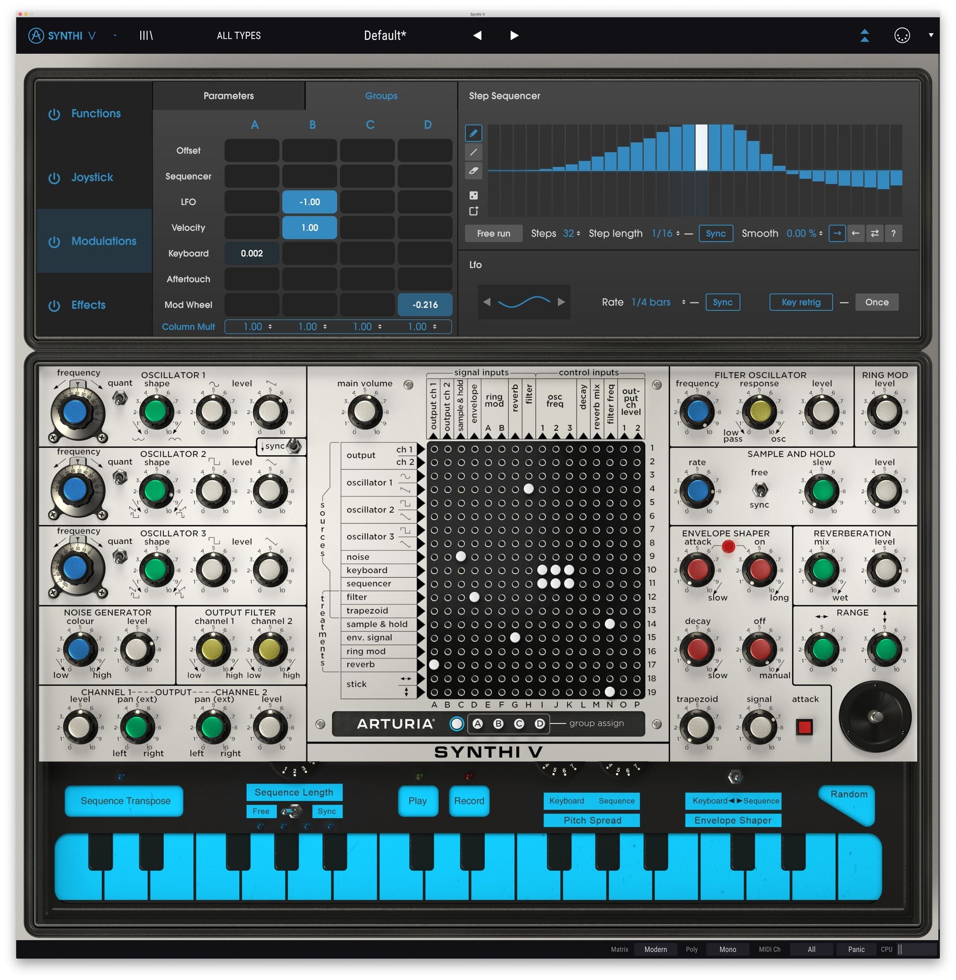Create sequences of up to 32 steps and assign them to pitch or any other parameter in Synthi V.