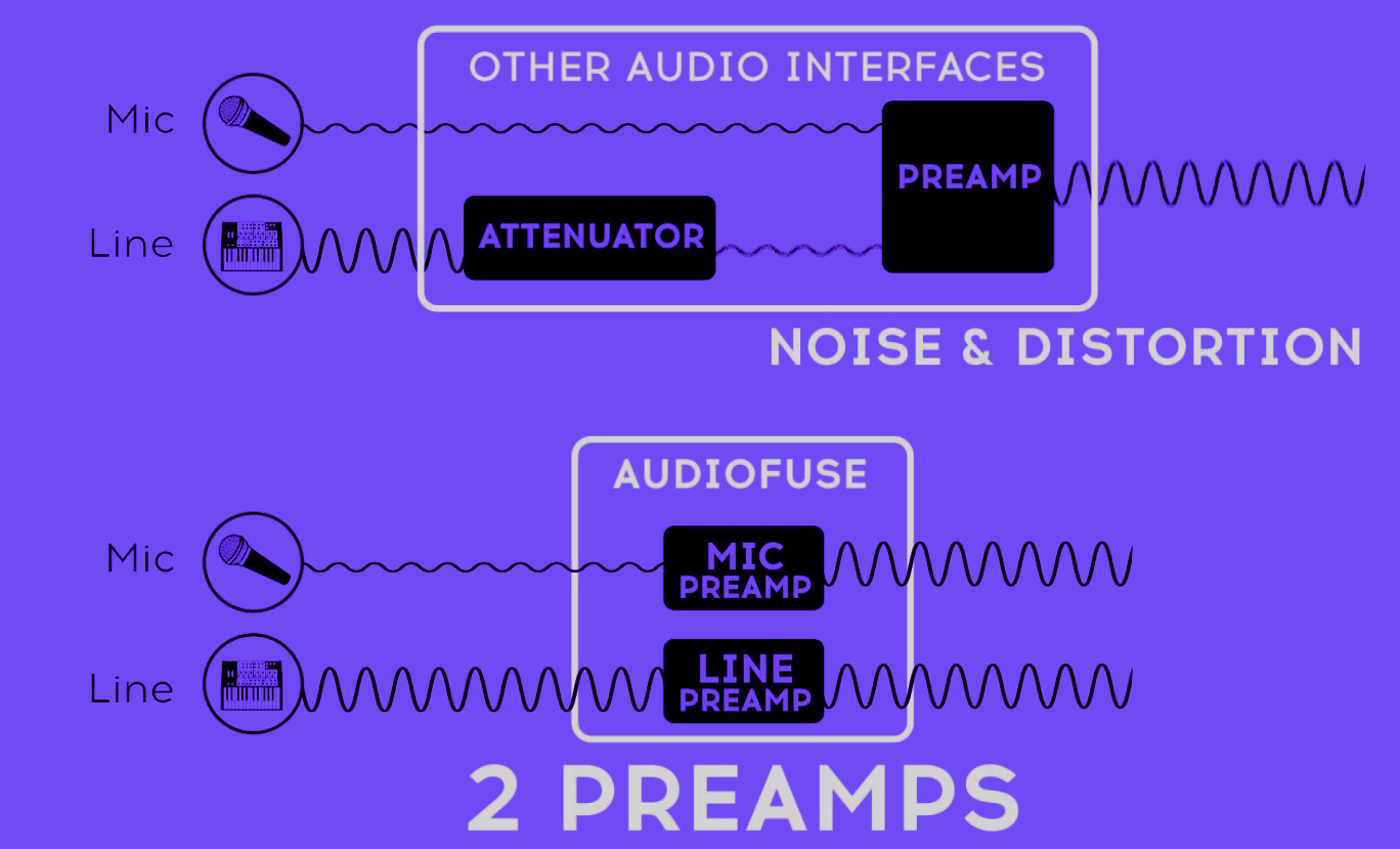 So, along with a team of analog audio experts and sound engineers, we used cutting-edge technology to improve on coveted design ideas from the golden age of analog consoles. The result is an exceptionally pristine analog microphone preamplifier circuit that captures the nuances of your mics—and performances—as accurately as possible. It's called DiscretePRO®, and it's the preamp technology at the heart of every AudioFuse.