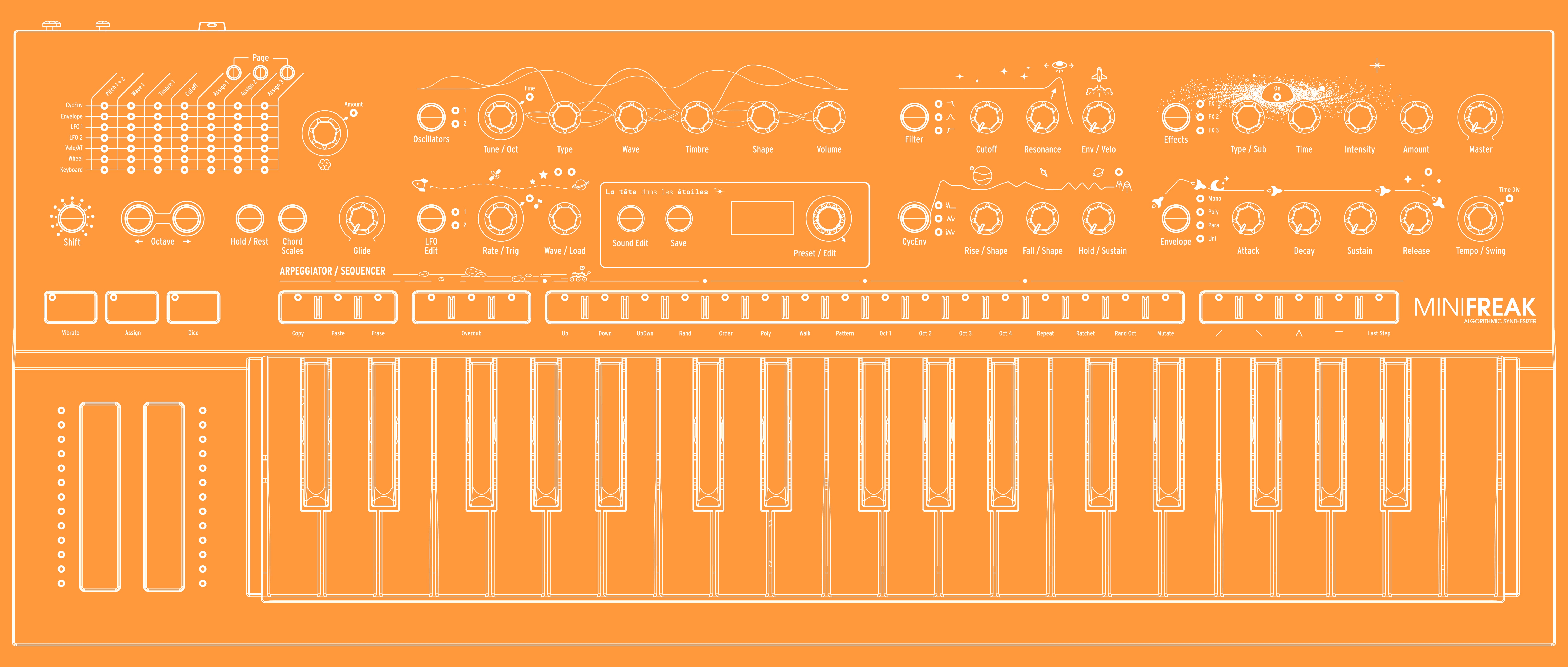 It’s not just the sleek all-black keys that stand out. MiniFreak Stellar is adorned with playful graphics that bring the signal chain to life and symbolize the unique effect of each control.