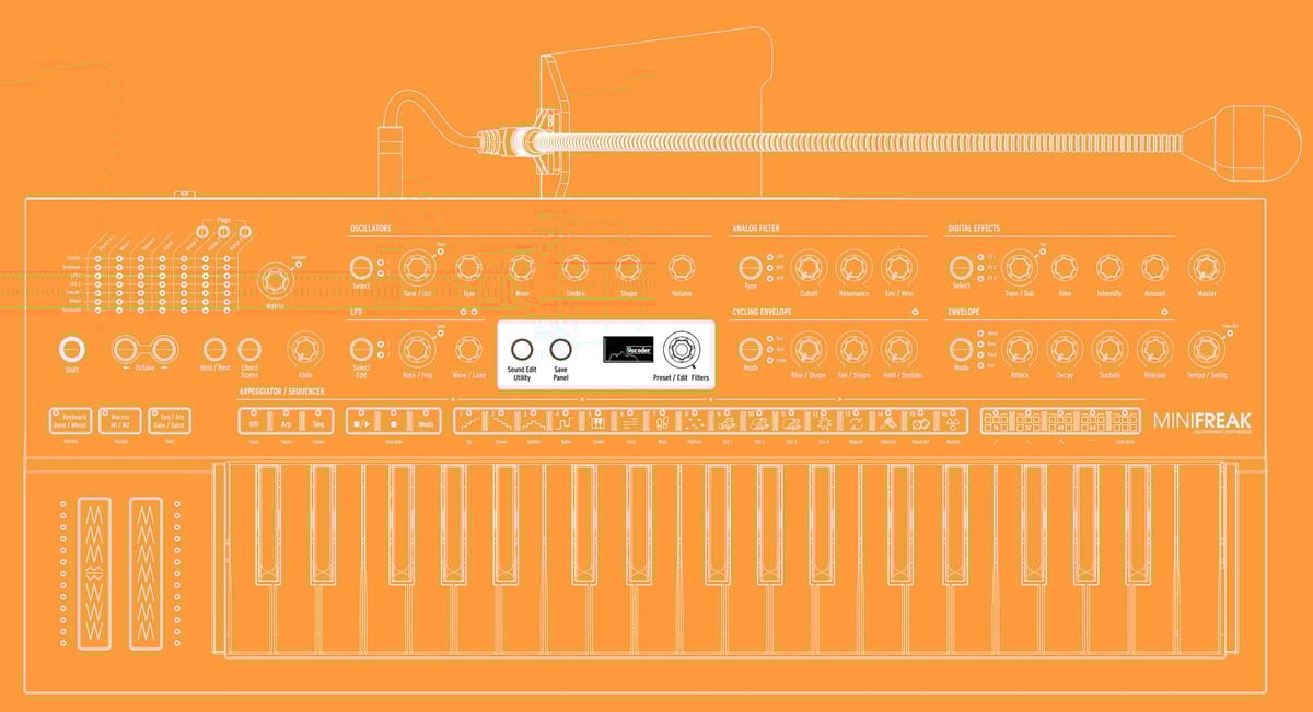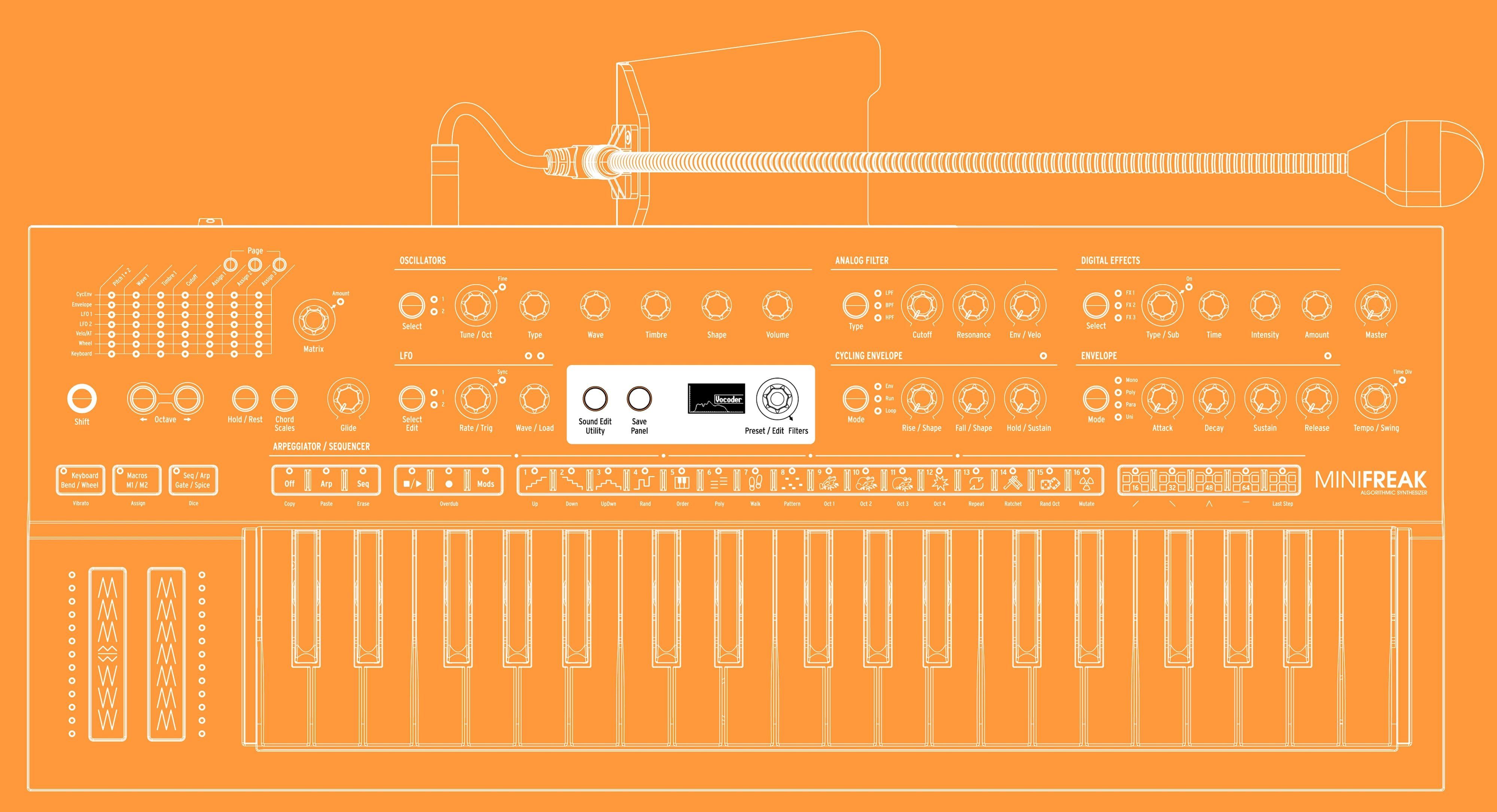 MiniFreak Vocoder is a special edition of the fearless polyphonic hybrid synth. The same dual digital engines, analog filters, modulation and sequencing power, now with a vocoder and gooseneck mic. Get creative with vocal or external input - from talkbox growls to spectral drones.