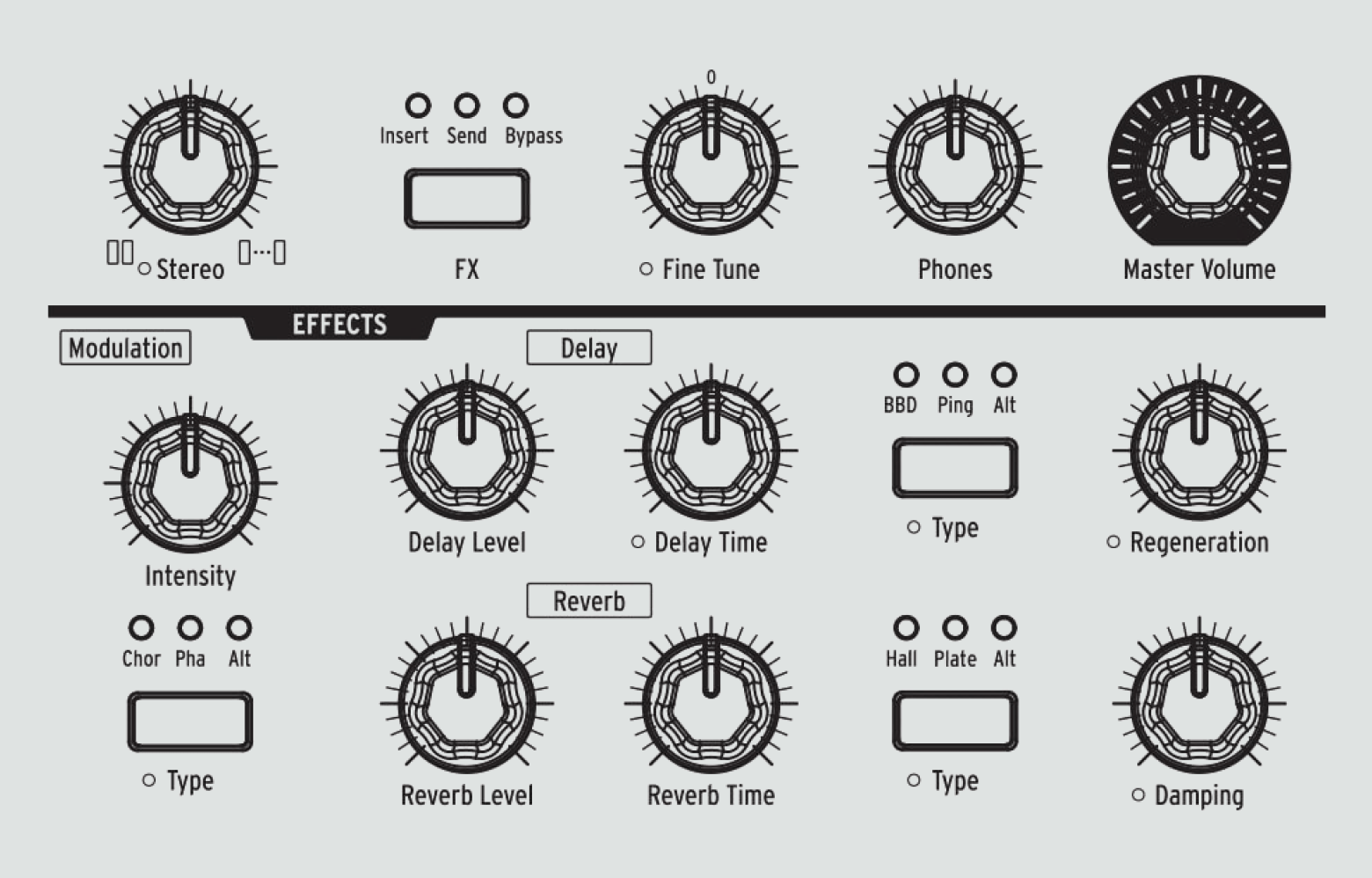PolyBrute’s effects are specially designed to take advantage of its complex stereo architecture - you even have the option of inserting them all inline before the output or configuring delay and reverb as a sidechain send.