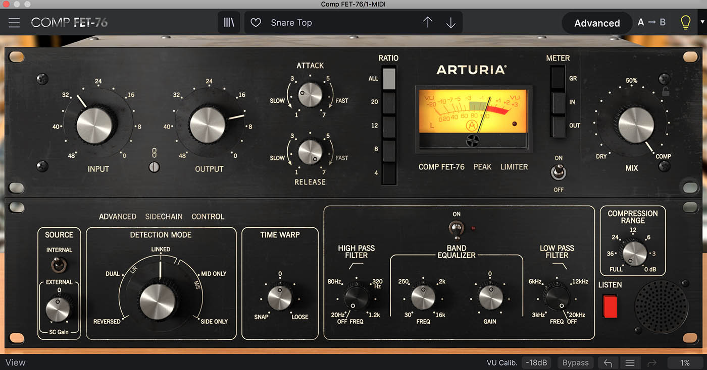 Ever wondered what sidechaining a legendary FET compressor would sound like? Spoilers: it sounds awesome. The advanced panel gives you access to contemporary sidechain controls with SSL-style EQ, as well as mid-side processing so you can carve exactly the sound you want to control the compressor.
