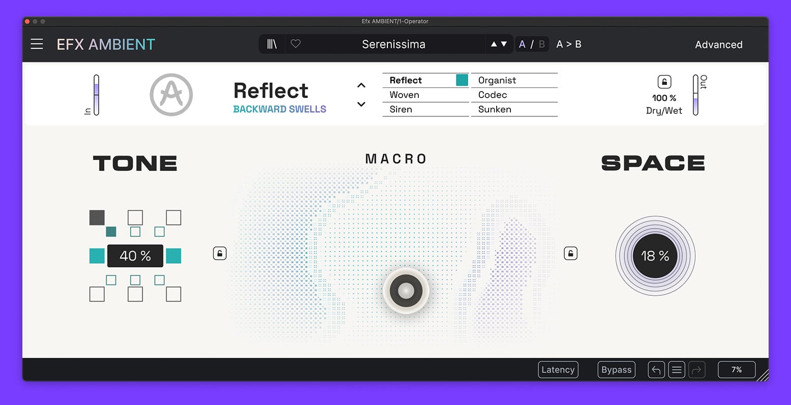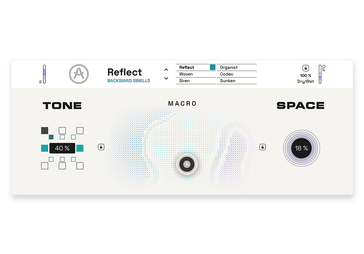 Choose Reflect, Woven, Siren, Organist, Codec, or Sunken — each with a dedicated Tone + Space signal path and a distinct sonic character, from time-based transformation to lo-fi degradation and harmonic bloom.