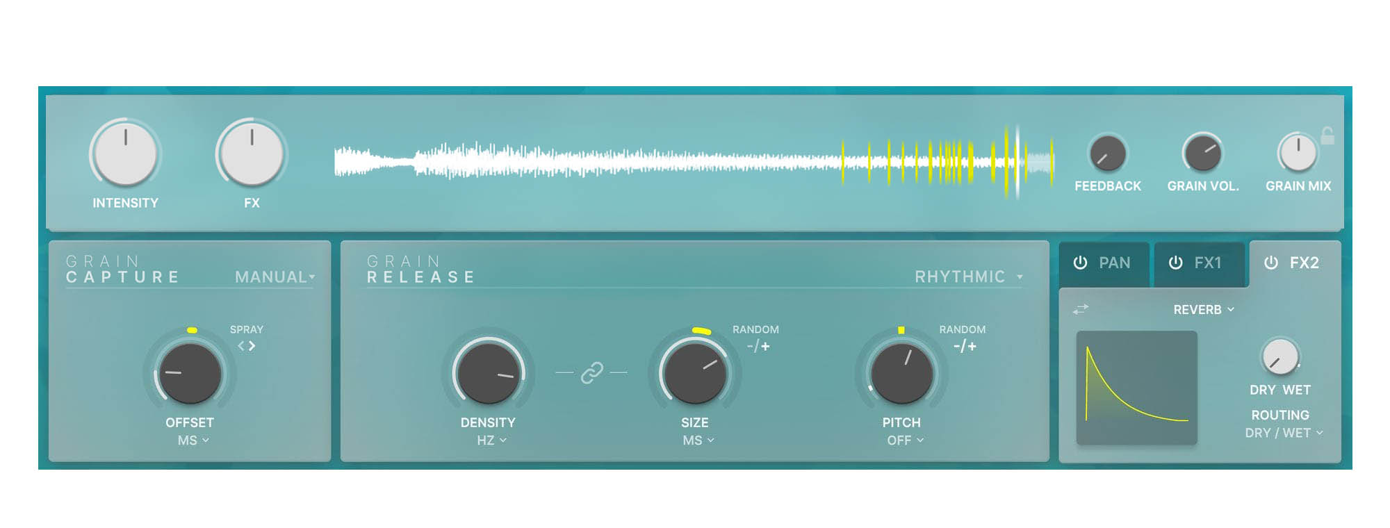 Rhythmic mode locks grain size and density in with tempo-matched values, ensuring that every grain pulses, flutters, and resonates in perfect sync with your project. Great for creating precise machine-like movement and mangled drum loops.