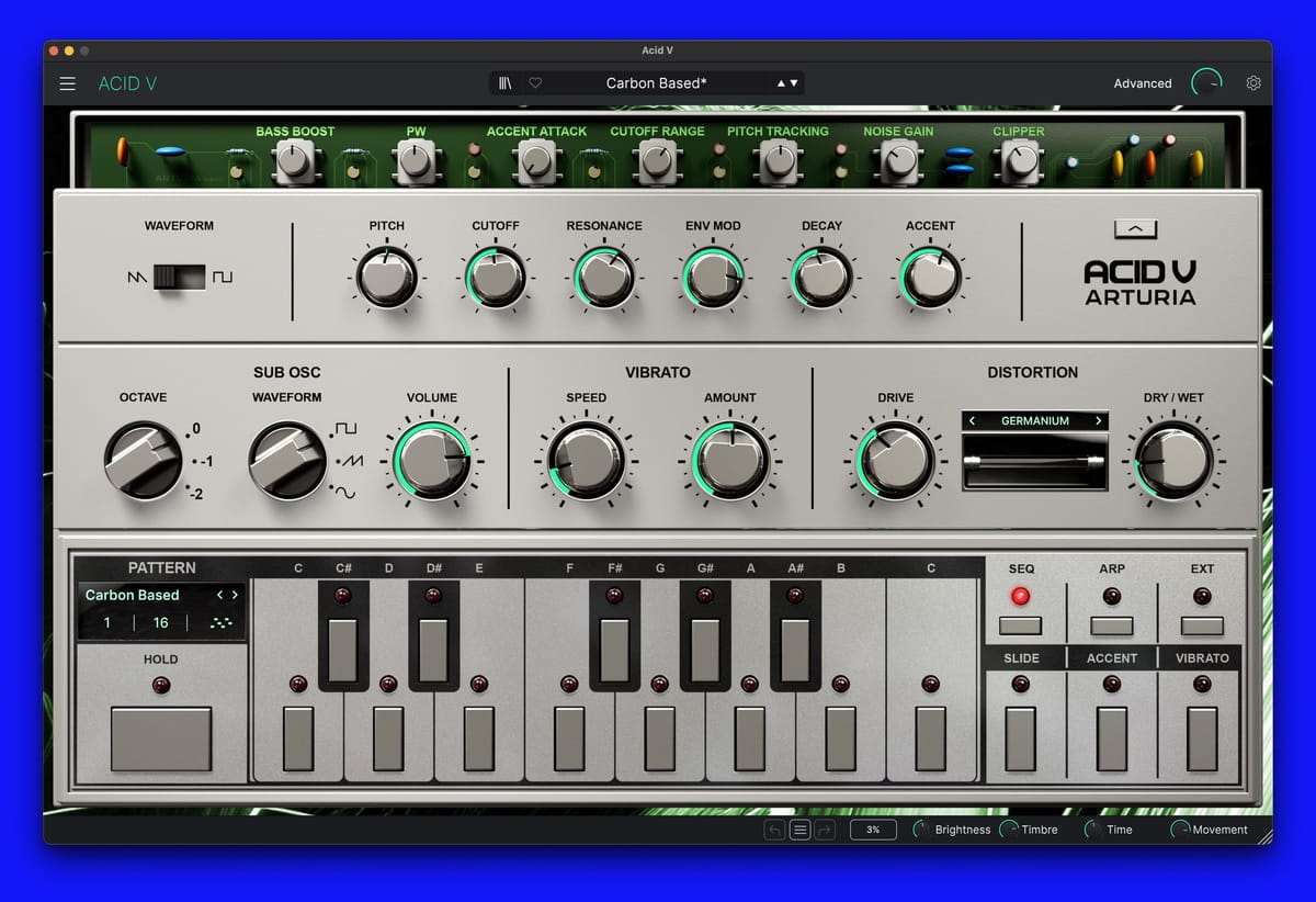 Crack open Acid V’s virtual panel to uncover detailed analog fine-tuning, letting you emulate the specific pitchy, drifty, noisy quirks of genuine vintage units.