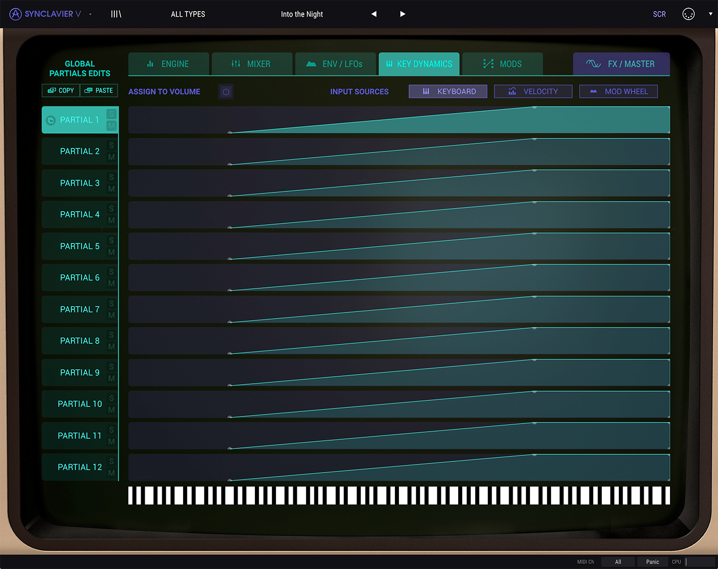 Split, layer, and crossfade all 12 Partials across the keyboard, and make them respond to velocity and the modulation wheel.