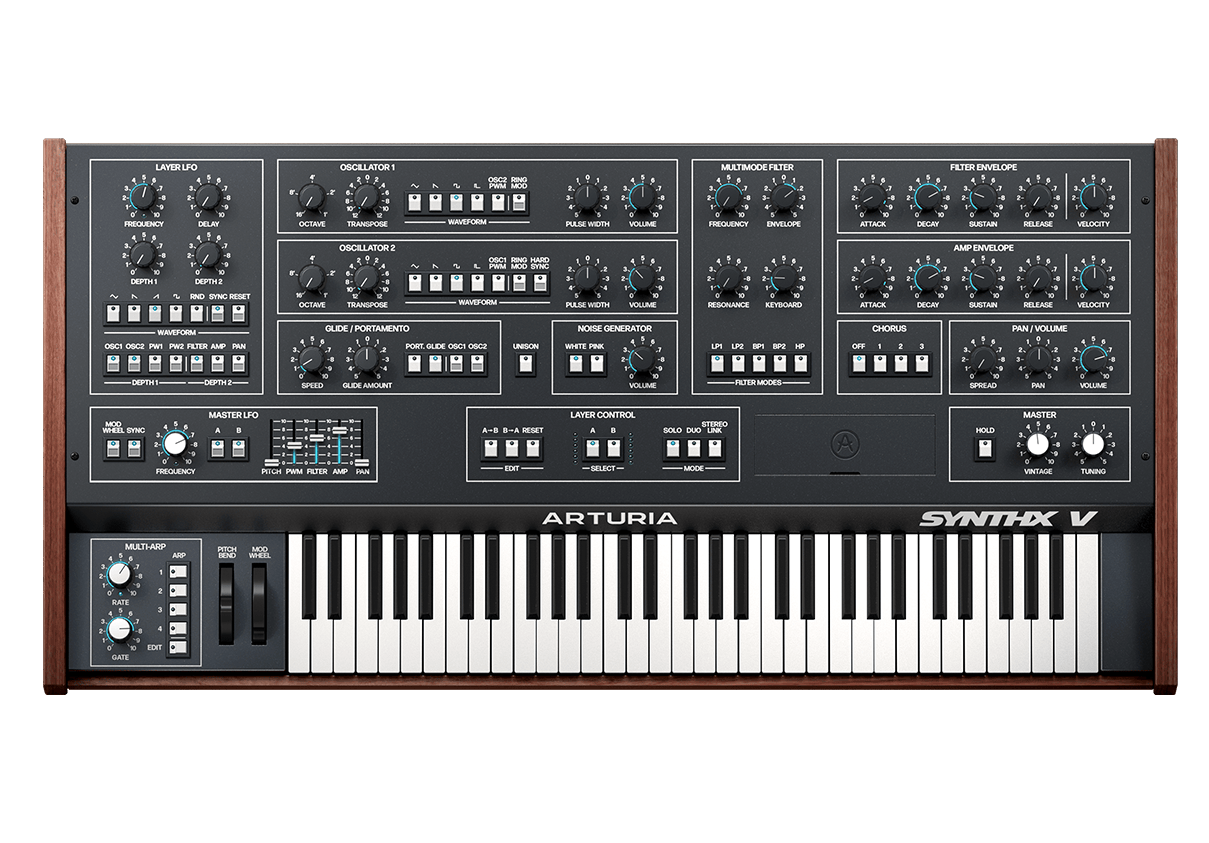 Synthx V incarnates the intuitive design and panoramic sound of the rarefied Italian icon, from its versatile and clean digitally-controlled oscillators to its famed multimode filter.