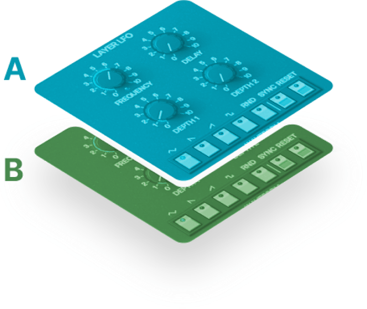 Per-layer LFO with extended routing, additional random waveform and Syncable rate, as well as Mono or Poly modes