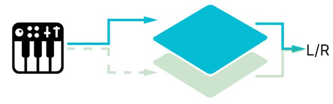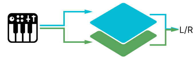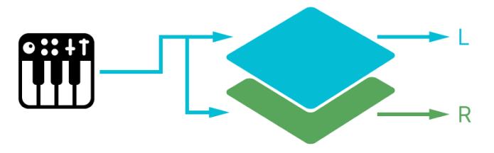 You control and play the selected layer, however the voicing is cloned and hard-panned left/right for a wide stereo image.