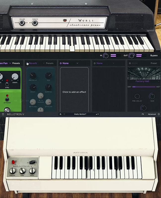 Vox Continental V sets the foundation, shaped into a low, mellow bed by pulling back the drawbars. Wurli V follows with a familiar preset at the core, then placed into the track with added reverb. For lift and atmosphere, Mellotron V completes the world with understated strings chosen for their classic, restrained character.