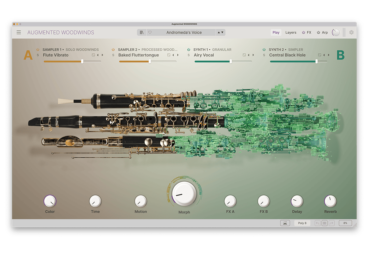 Effortlessly animate and transform woodwind layers from traditional acoustic timbres to experimental synthesis, all via intuitive Morph and macro controls.