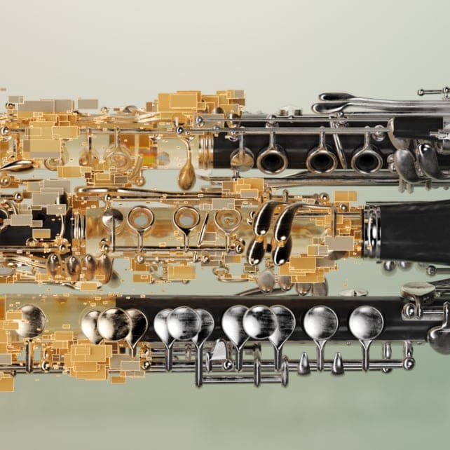 An acoustic natural woodwind swells with granulation that morphs into a rhythmic and noisy field.